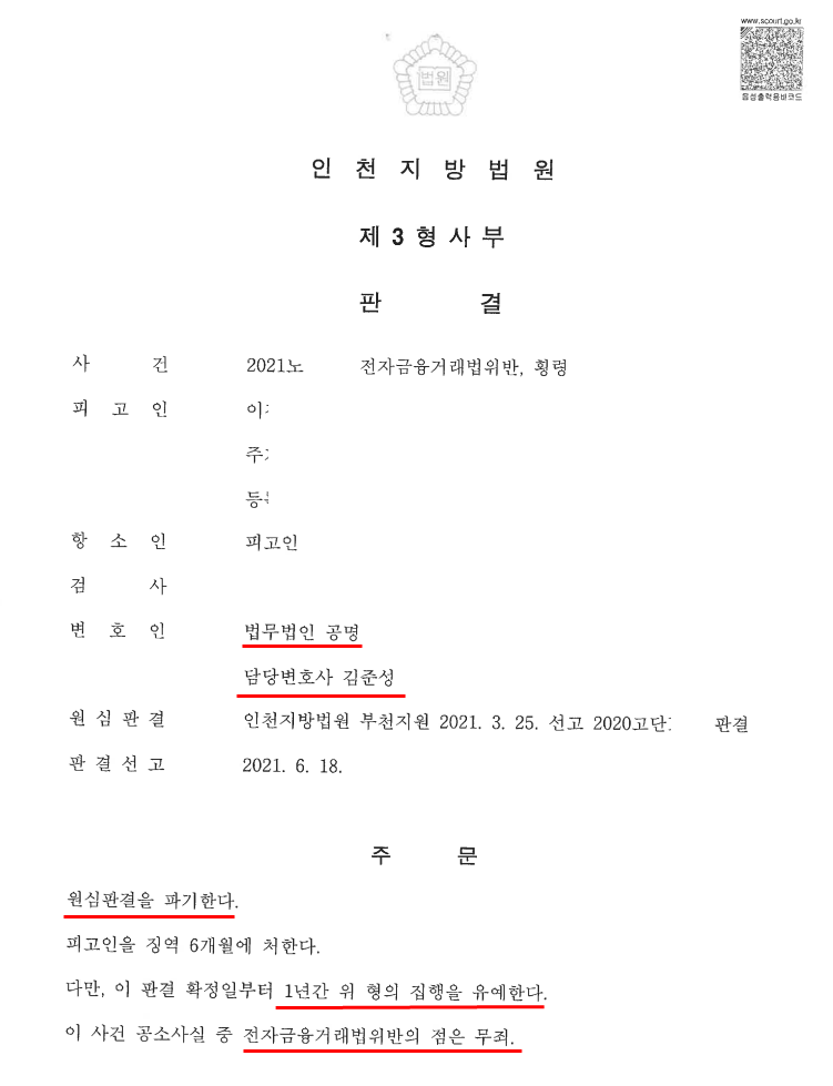 인천지방법원은 김준성 변호사의 위 주장을 받아들여 피고인의 항소를 인용하여 전자금융거래법위반의 점에 대해서는 무죄, 횡령죄에 대해서는 집해유예의 판결을 선고하였습니다.