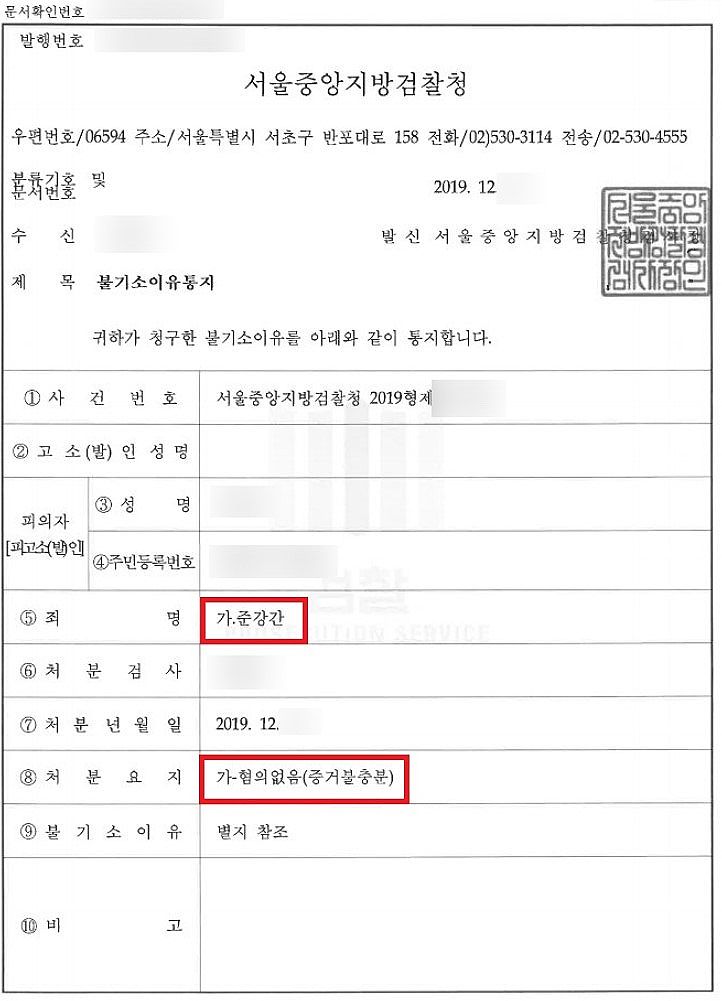 <불기소이유통지서 중>