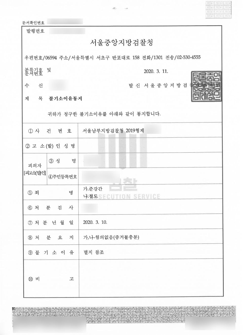 <불기소이유통지서 중>