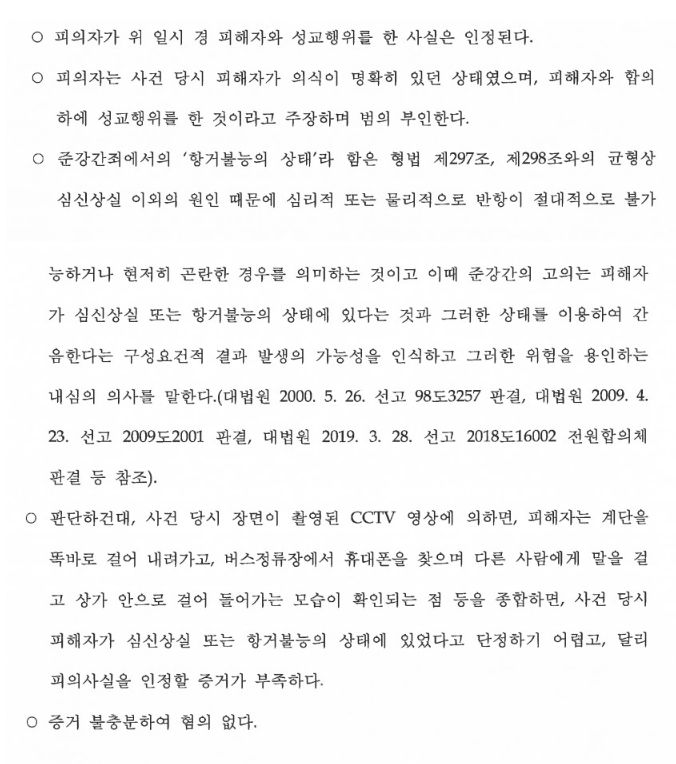 위 불기소이유통지서는 정말 간단하게 써져있습니다. 하지만 정말 중요한 내용은 빠져있습니다. 검사도 이를 기재하기 어려웠던 것 같습니다. 예상대로 성관계가 있었던 계단에는 CCTV가 있었습니다. 성관계 장면이 찍혀있었는데요. 엘리베이터에서의 영상은 여성이 술에 취해 의뢰인의 부축을 받는 모습이었습니다. 하지만 계단에서의 영상은 흐릿하지만 술에 다소 취한듯 보이는 여성이 의뢰인과 비교적 정상적으로 성관계를 하는 모습이었습니다. 구체적으로 말씀드리자면, 여성은 의뢰인에게 구강성교를 해주고 있었고, 여성상위체위로 성관계를 하는 영상이었습니다.