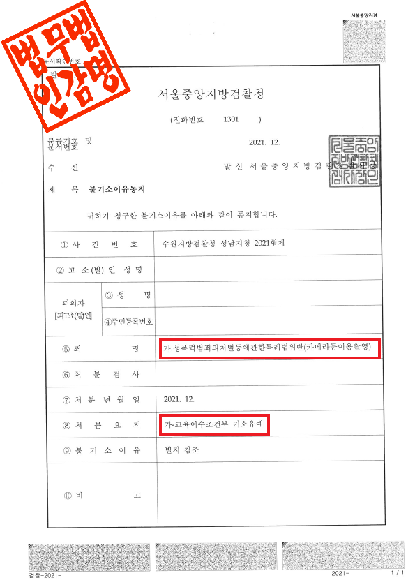 수원지방검찰청 성남지청은 이 사건에 대해 다음과 같은 사유로 불기소 처분을 하였습니다.