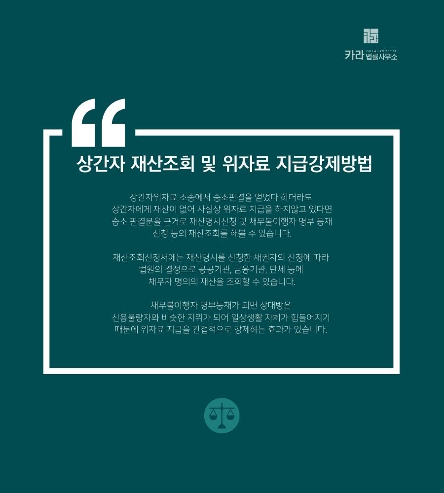 상간자위자료 소송에서 승소판결을 얻었다 하더라도 상간자에게 재산이 없어 사실상 위자료 지급을 하지않고 있다면 승소 판결문을 근거로 재산명시신청 및 채무불이행자 명부 등재 신청 등의 재산조회를 해볼 수 있습니다.