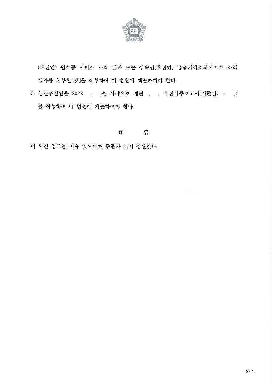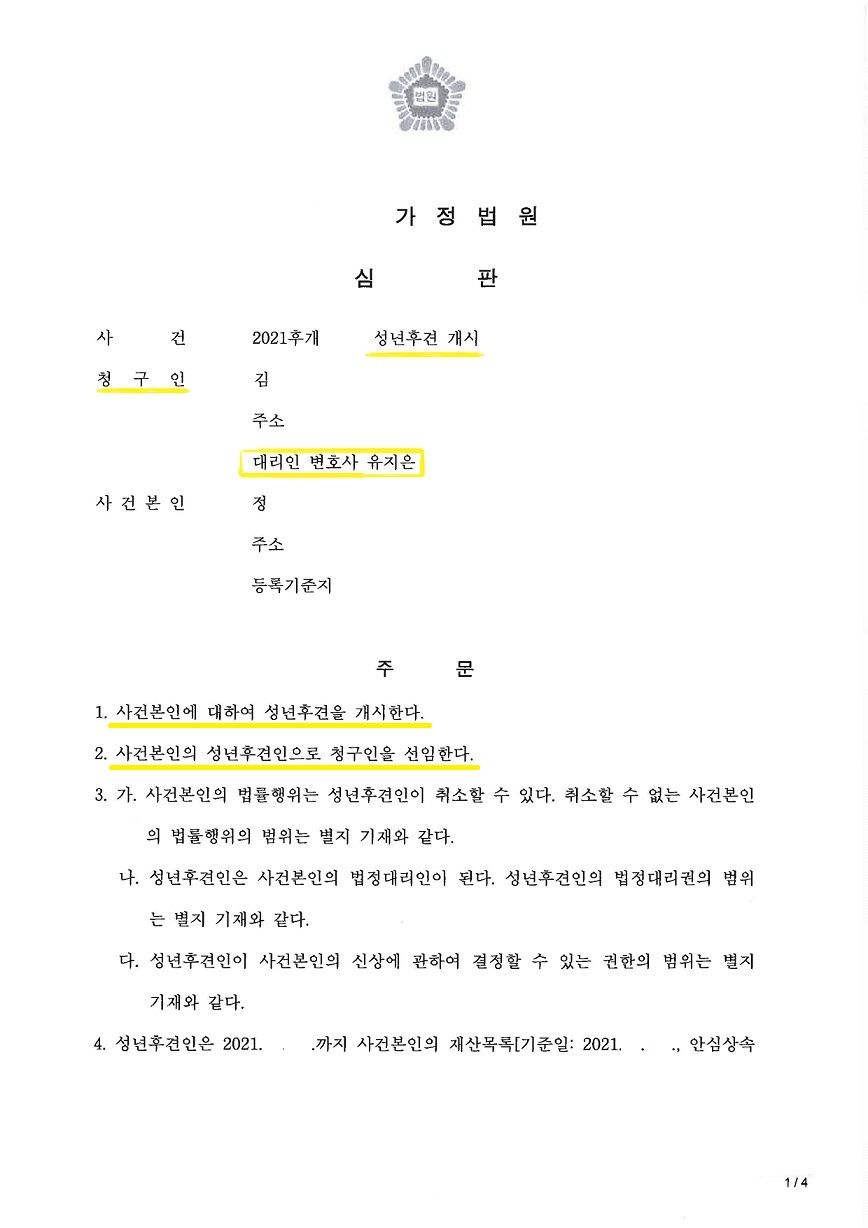 의뢰인의 어머니는 92세의 고령으로 치매 판정을 받아 인지기능이 지속적으로 저하되어 있는 상태였고, 이와 같은 사정 및 계속적인 보호가 필요한 상황임을 소명하여 성년후견이 개시될 필요성을 적극 주장하였습니다. 또한 선순위 추정상속인들 전원의 동의를 받아 성년후견인으로 아들인 의뢰인을 선임해달라고 요청하였으며, 이에 따라 아들인 의뢰인이 어머니의 성년후견인으로 선임될 수가 있었습니다.