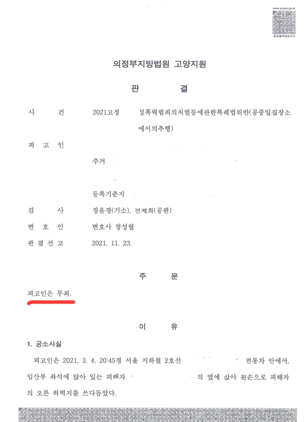 오늘은 지하철과 같이 사람들이 많은 곳에서 다른 사람의 신체 부위를 접촉하는 사건이 발생해 성폭력범죄의 처벌 등에 관한 특례법(이하 '성폭력범죄처벌법') 제11조의 공중밀집장소에서의 추행 혐의로 재판에 넘겨졌다가 저희 율도 합동법률사무소의 도움으로 1심에서 무죄판결을 받은 사례를 소개해 드리려고 합니다.