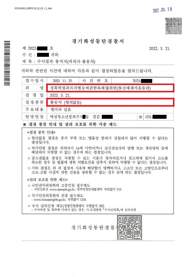 이러한 저의 조력을 바탕으로 A씨는 전혀 모르는 사람에게 다짜고짜 성기 사진을 전송하였음에도 불구하고 '불송치(혐의없음)' 결정을 받음으로써 성범죄자가 될 위기에서 벗어날 수 있었습니다.