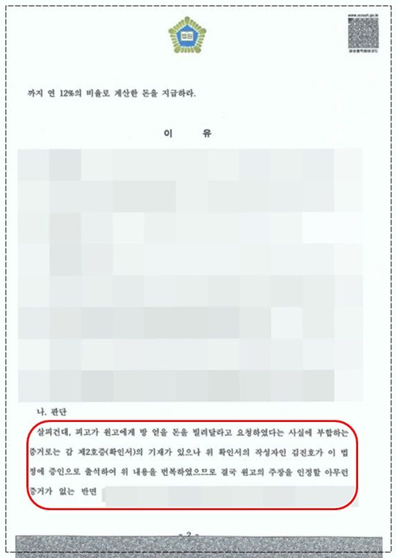 1. 원고가 피고에게 돈을 빌려 주었다고 주장하며, 은행입금증(보낸사람이 원고, 받는 사람은 피고, 송금액 등 피고에게 대여하였다는 금융내역이 다 나옴)과 피고에게 돈을 빌려주기 직전 원고의 큰오빠가 “설마 그 돈 떼어먹겠냐”며, “피고에게 돈 빌려 줘도 괜찮으니 빌려 줘라”라는 의견을 원고에게 얘기해 주었고, 이에 원고가 자신의 권유로 돈을 빌려준 것은 틀림 없는 사실이다라는 내용의 큰 오빠의 확인서를 증거로 제출한 뒤(여기 까지만 보면 원고의 대여 주장은 그럴 듯 하다), 아니나 다를까 원고의 신청으로 큰 오빠가 법정 증언을 하였는데, 사건 초기 판사님은 가족들(원,피고도 가족사이) 사이에 차용증을 잘 안 쓰는 것이 오히려 당연하니, 피고에게 돈이 송금된 내역과 오빠의 확인서 만으로도 원고 주장이 맞다는 강한 심증을 가진 것 같았고, 오빠가 법정 증언까지 한다면 판사님이 원고 청구를 인용할 개연성이 높았습니다. 증거에 의해 재판을 한다지만 재판도 인간이 하는 일이라 조각 증거와 위증에 의해 편견과 선입견이 결과에 작용할 수 밖에 없습니다.