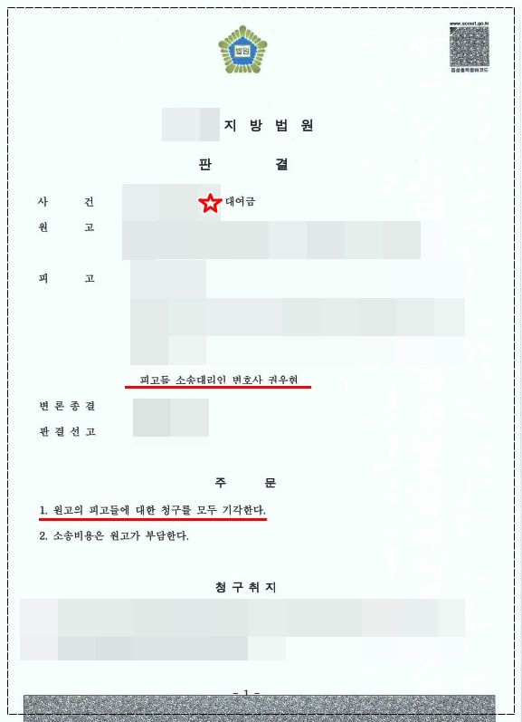 *차용증 있는 대여금 소송에서 피고 승소한 사례를 하나 소개합니다.