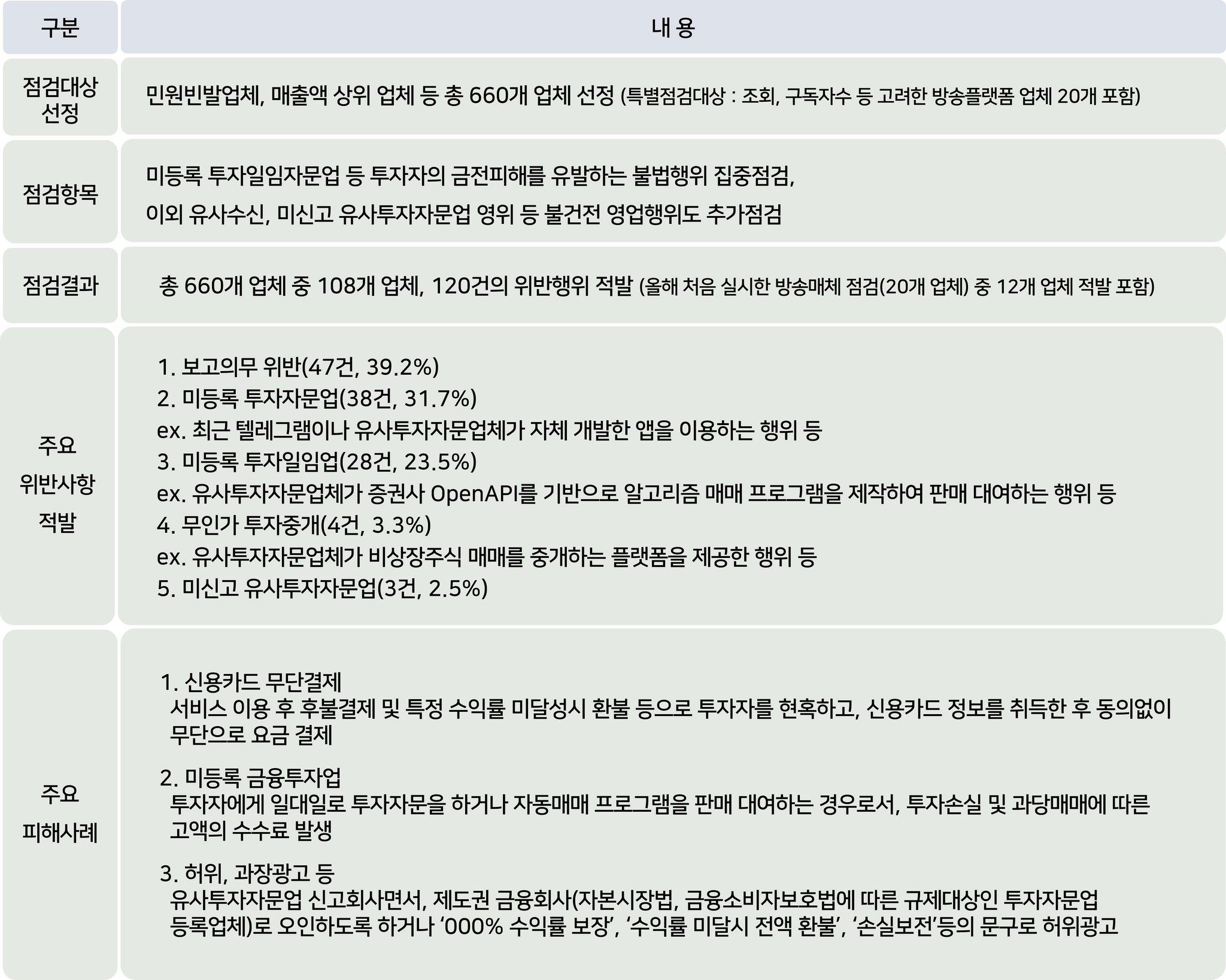 현 제도개편의 공백을 우려하여 금융감독원은 한국거래소, 금융투자협회와 공동으로 유사투자자문업체의 영업행위를 점검하였는데, 해당 내용은 아래 표와 같습니다.