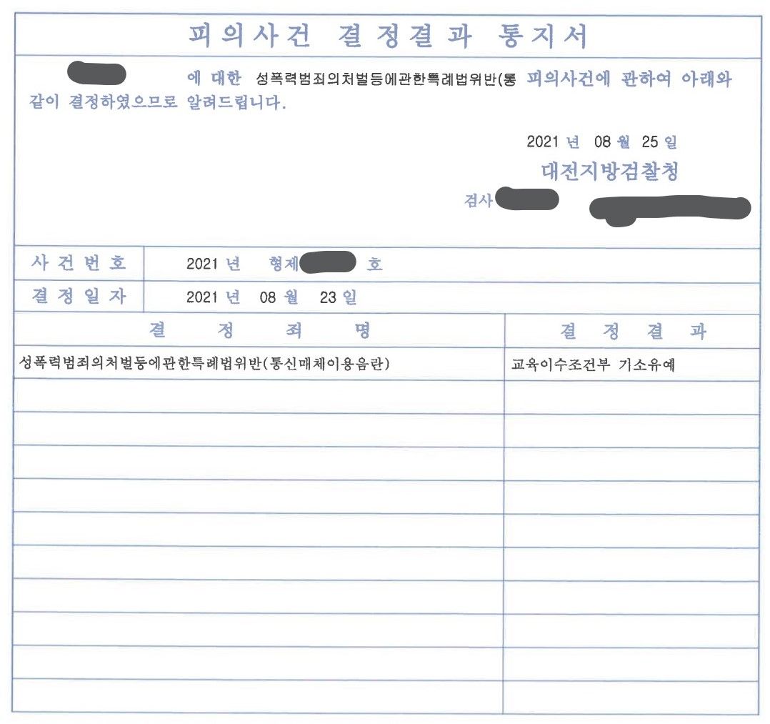 결국 검사는 주영재 변호사의 주장을 받아들여 의뢰인에 대한 처벌이 불필요하다고 판단해 교육조건부 기소유예 결정을 내렸습니다.