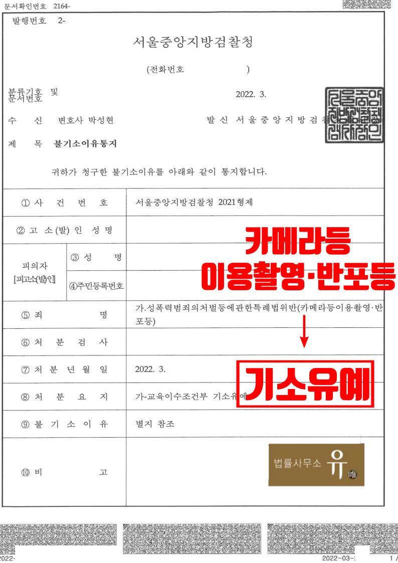 법률사무소 유(唯) 형사전문변호사의 조력 결과 서울중앙지방검찰청은 의뢰인에 대해 기소유예 처분을 하였습니다.