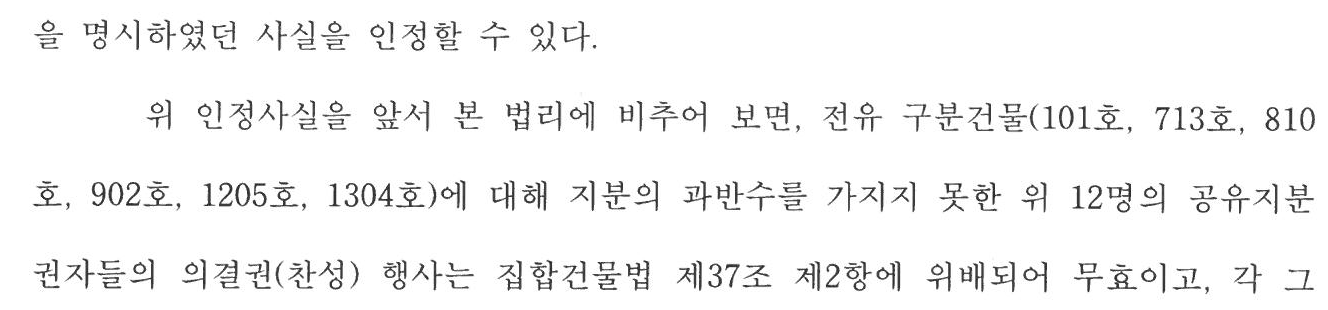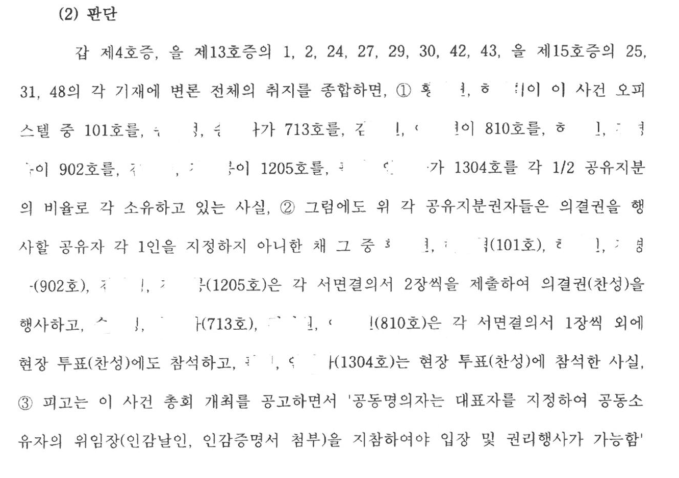 나. 집합건물/상가/오피스텔이 공동소유로 되어 있는 경우, 즉 전유부분을 수인이 공유하는 경우에는 공유자들이 관리단집회에서 의결권을 어떻게 행사하여야 유효한지 실무상 문제되는 경우가 많은데, 여기서 논의할 사안은 예를 들어, 관리단 집회 안건인 관리인 선임 안건에 대하여 집합건물인 오피스텔을 공동소유하는 공유자들 중 갑(공유지분1/2)과 을(공유지분1/2)은(제101호), 같은 의사로 각각 찬성으로 표기하여 서면결의서를 각각 제출하였고, 공유자들 중 병(공유지분1/2)과 정(공유지분1/2)은(제102호), 같은 의사로 각각 찬성으로 표기하여 한명은 서면결의서를 제출하고, 한명은 직접 관리단집회에 출석하여 현장에서 투표하는 경우에, 위 구분소유 점포 제101호, 제102호에 대한 의결권 행사를 유효로 해야 하는지 문제됩니다. 공유자들이 동일 안건에 대하여 동일치된 의사로 의결권을 행사하였으므로 유효라고 볼 것인지 아니면 집합건물법 제37조 제2항 규정취지에 비추어 무효라고 볼 것인지 문제됩니다.