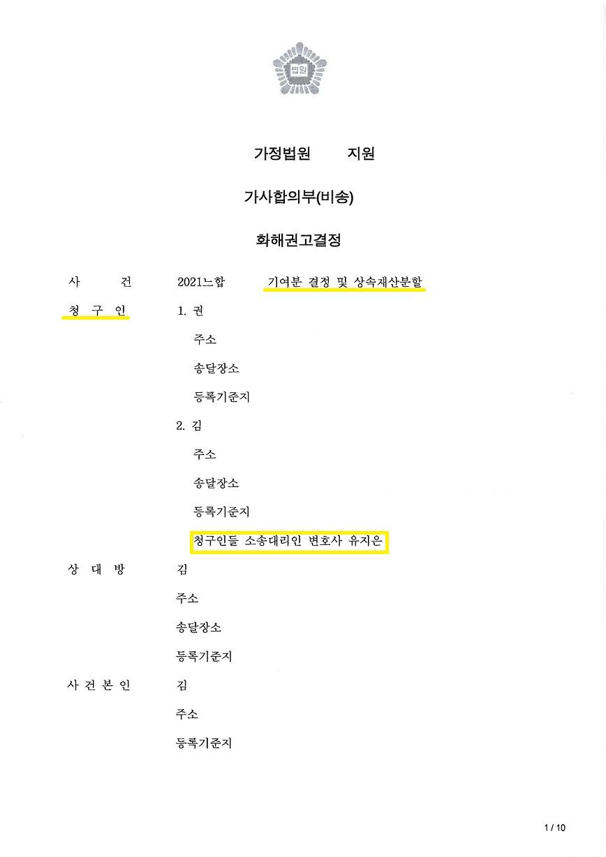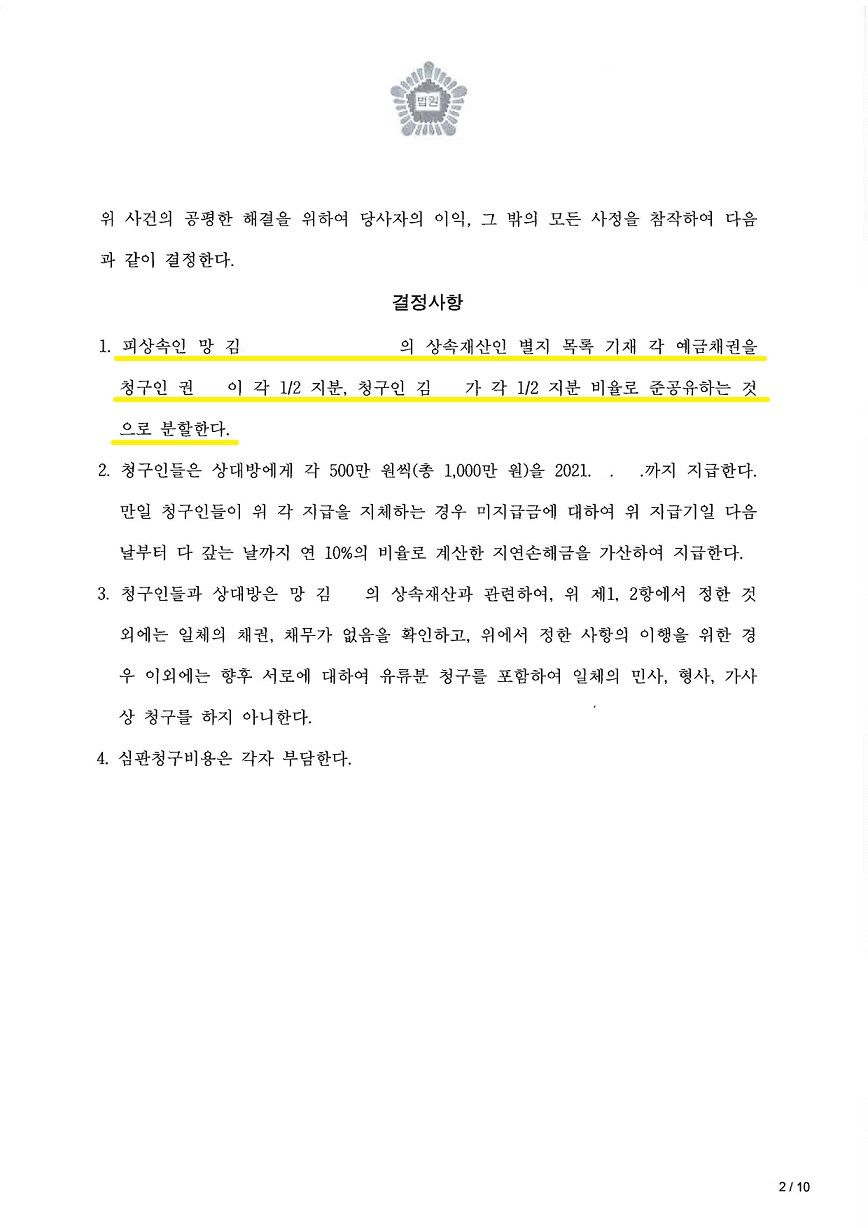 그 결과 상속재산 1억 원 가운데 천만 원만 상대방에게 지급하고 남아있는 9천만 원 상당의 예금채권을 전부 의뢰인들이 받아오는 것으로 성공적으로 합의가 되었으며, 결과적으로 의뢰인에게 기여분 50% 이상이 인정된 결과를 가져오며 의뢰인들이 만족스럽게 마무리가 된 사안입니다.