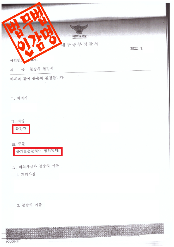 대구중부경찰서는 이 사건에 대해 다음과 같은 사유로 불송치 결정을 하였습니다.
