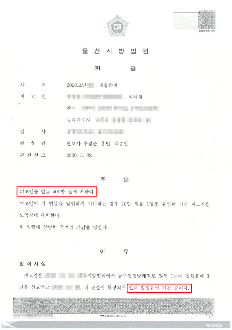 - 다수 범죄경력을 가지고 이에 더하여 공무집행방해죄로 집행유예 기간 중이었던 의뢰인이 유흥주점 기물을 파손하고 구속영장이 발부되어 구속중이었던 사안