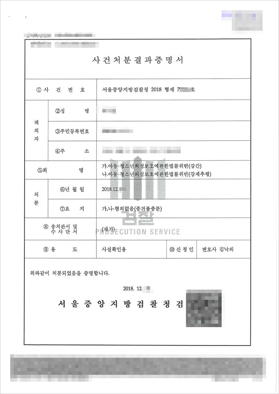 긴 수사 기간의 어려움을 이겨낸 끝에, 의뢰인은 최종적으로 증거불충분으로 무혐의 처분을 받았습니다.- 무죄
