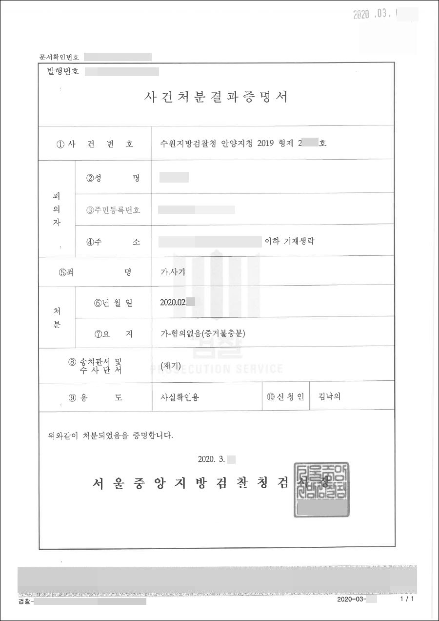 의뢰인은 이미 경찰 1차 조사를 받은 뒤 법승을 찾아 왔지만, 변호인은 피의자 신문조서를 열람하여 1차 조사 내용을 확인한 뒤, 전반적으로 사건을 다시 정리하여 입증자료와 의견서를 제출하였습니다. 또한 모든 수사과정에 입회하여 수사기관이 갖는 의문점을 적기에 해소시켜 주고, 의뢰인이 주장한 상대방의 고소 의도를 부각시키며, 그리고 발 빠르게 제3자에 대한 형사고소를 조언함으로써 의뢰인 주장에 신빙성을 실어 주었습니다.