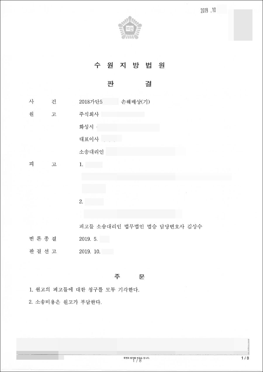 이러한 법승 변호인의 조력으로 원고의 청구는 전부 기각되었습니다.