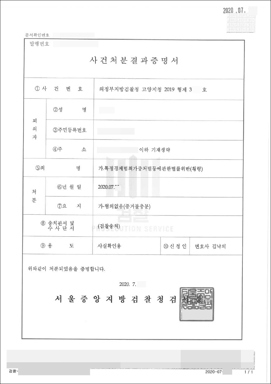 이러한 법승 변호인의 조력으로 의뢰인은 특정경제범죄가중처벌등에관한법률위반(횡령) 혐의에 대해 혐의없음(증거불충분) 처분을 받았습니다.