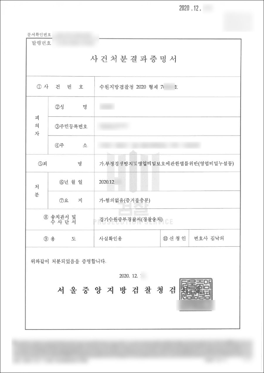 위와 같이 변호인 입회하에 약 2차례의 조사를 받고 의뢰인의 변소 의견 및 이를 뒷받침하는 자료를 제출함으로써 의뢰인은 혐의없음(증거불충분) 처분을 받았습니다.