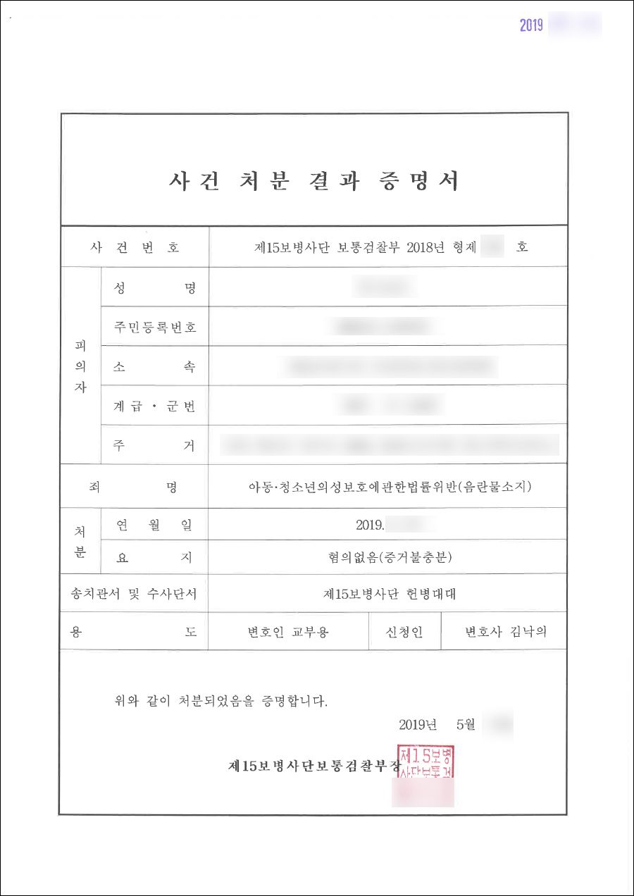 의뢰인은 군인 신분이어서 자칫 처벌을 받게 될 경우 신분상의 불이익을 당할 우려가 있어 매우 조심스러운 사건이었습니다. 무엇보다도 의뢰인이 자신의 혐의를 적극 부인하였기 때문에 법승의 김낙의 변호사와 초기 수사부터 사건을 진행하였습니다. 의뢰인은 아청물 유포, 소지로 혐의를 받고 있는 해당 시간대에 숙소에 있지 않았고 컴퓨터를 하지 않았다는 알리바이 주장을 하였고, 본 변호인은 의뢰인의 컴퓨터 로그인 기록 검색을 먼저 요청하였습니다. 그리고 해당 시간에 숙소에 있지 않았다는 점을 입증하기 위해 숙소 출입문 cctv를 빠른 시간에 확보하였습니다.