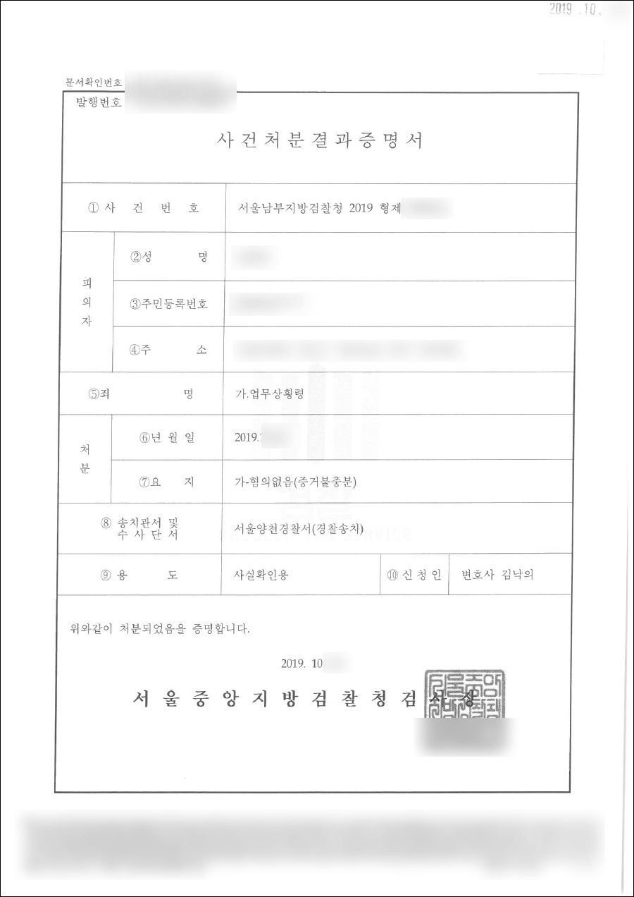 수사기관은 변호인 의견을 적극적으로 반영하여 업무상배임 혐의에 대해 혐의없음(증거불충분) 처분을 내렸습니다.- 혐의없음
