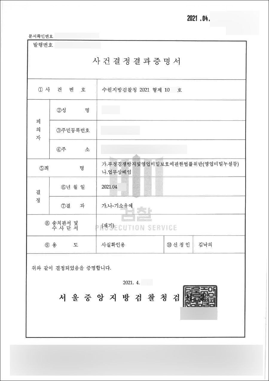 최종적으로 검찰청은 의뢰인에게 적용된 부정경쟁방지및영업비밀보호에관한법률위반(영업비밀누설 등), 업무상 배임 등 혐의에 대한 기소유예를 결정했습니다.
