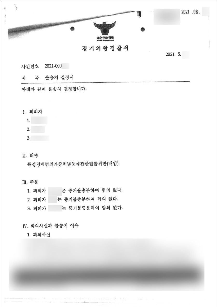 그 결과 의뢰인들은 14억 원의 특경볍(배임) 사건에도 불구하고 각각 1차례의 조사를 받고 조사 시작 약 3개월 만에 수사기관으로부터 혐의없음 불송치결정을 받을 수 있었습니다.