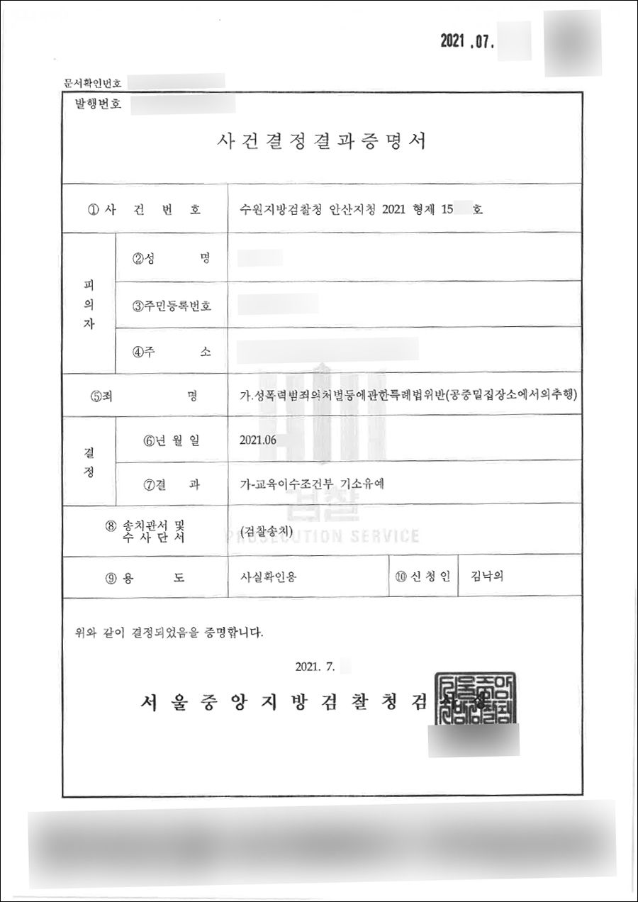 그 결과 검찰은 초범이었고, 잘못을 인정하는 진정성 있는 반성의 태도를 감안하여 의뢰인의 성폭법위반 혐의에 대한 기소유예처분을 결정해주었습니다.