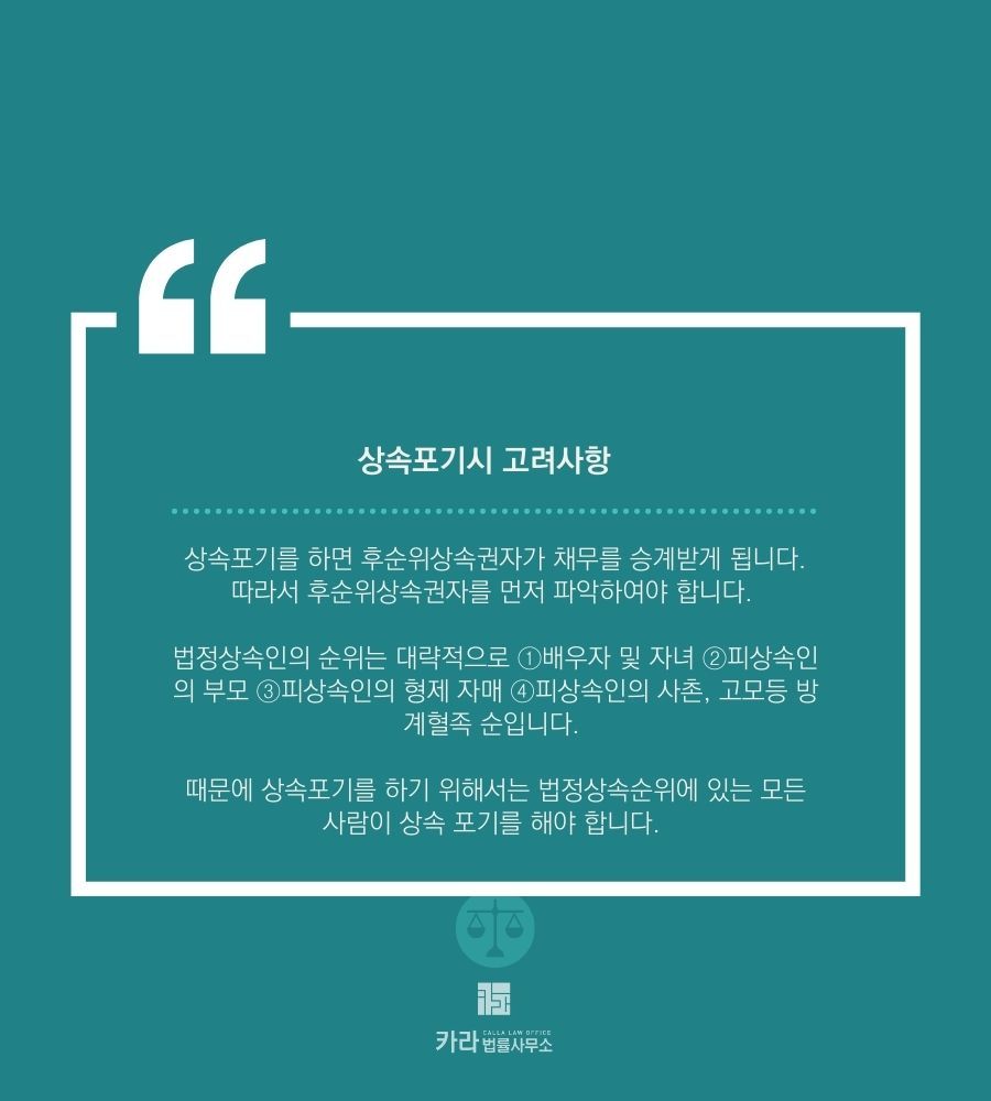 따라서 남은 유산보다 채무가 많아 채무 상속을 피하고자 하는 경우, 후순위상속권자가 없거나 적다면 상속포기가 유리하다고 할 수 있습니다.