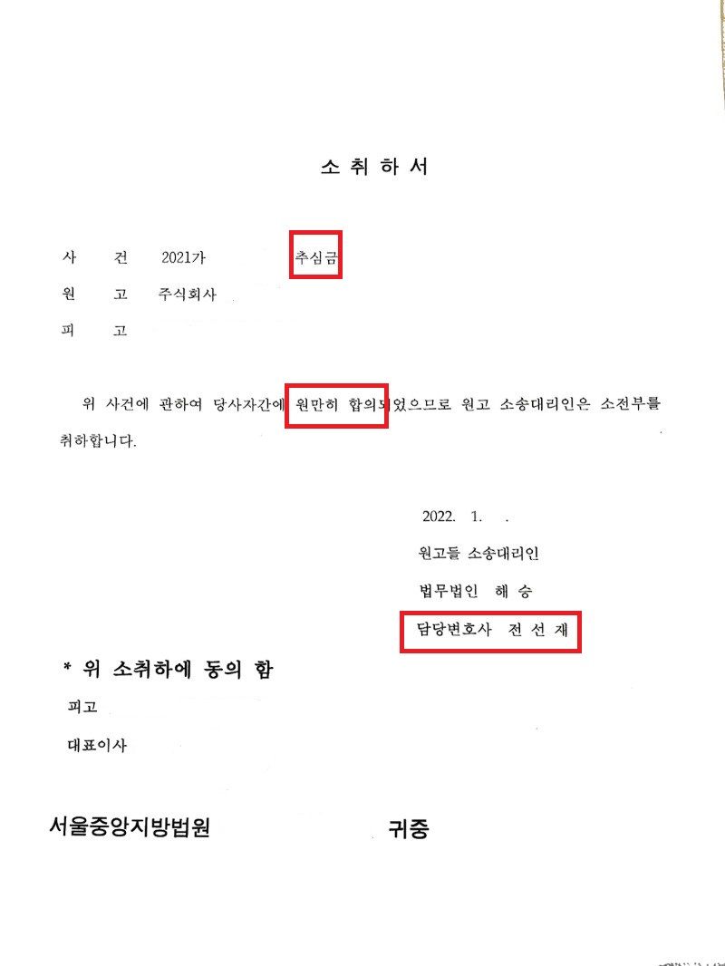 전선재 변호사가 적극적으로 변론을 한 결과, 상대방인 피고 보험회사가 원고를 상대로 소취하 조건부 합의의사를 전달하였습니다. 이에 원고는 원만히 3천만원을 변제받고 소송을 취하할 수 있었습니다.