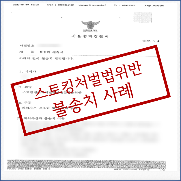 따라서 스토킹 가해자로 신고된 경우에는 초기부터 신속하게 변호인의 도움을 받아 합의 절차를 진행하거나 적극적으로 법리 주장을 하여야 합니다. 위 사안 또한 연인 간에 다소 억울하게 스토킹처벌법으로 신고된 사례로 개인이 직접 불가능한 합의를 원만하게 이끌어 내어 검찰 단계에 가기 전 경찰 단계에서 불송치 처분을 받았습니다.