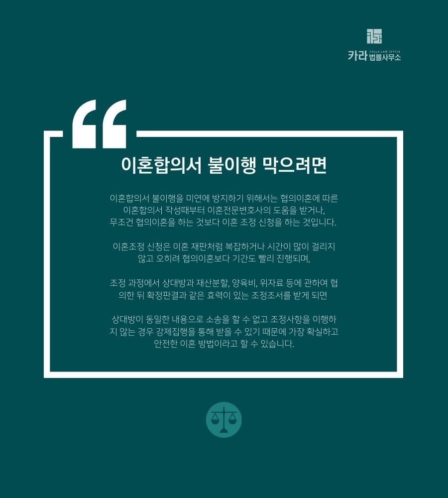 따라서 이혼합의서 불이행을 미연에 방지하기 위해서는 협의이혼에 따른 이혼합의서 작성때부터 이혼전문변호사의 도움을 받아 재산분할의 내용을 분명하게 정하거나 이행판결 등 집행권원 없이도 강제집행이 가능한 내용으로 공증을 받을 수 있도록 하는 것이 필요합니다.