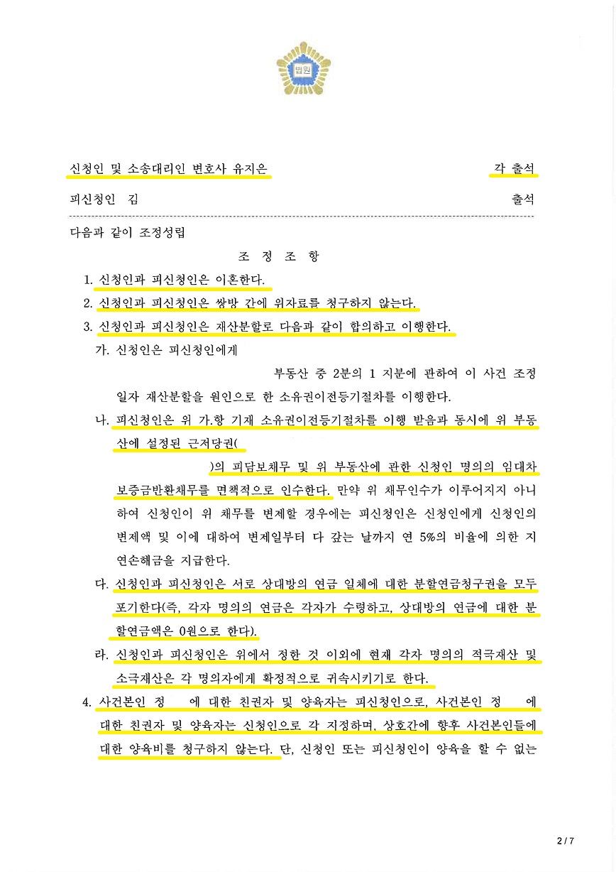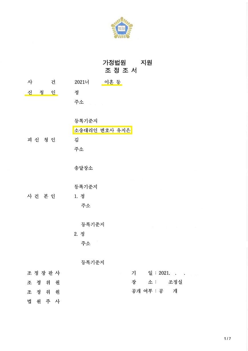 이에 상호 간의 잘잘못을 따지지 않고 조속한 시일 내에 원만한 이혼을 원한다는 취지로 조정신청서를 접수하였고, 의뢰인 소유의 다른 부동산들은 부모님으로부터 증여받은 특유재산이므로 분할대상 재산에서 제외하고, 공동명의로 되어 있는 부동산만 분할대상 재산에 포함시키되, 지분을 이전해주는 대신 담보대출금 및 임대차보증금반환채무 전부를 상대방이 부담하는 것으로 합의를 시도하였습니다. 또한 의뢰인이 원하는 바와 같이 아이들은 한 명씩 분리하여 양육하고, 대신 상호 간에 양육비를 청구하지 않는 내용으로 조정을 시도하였습니다.