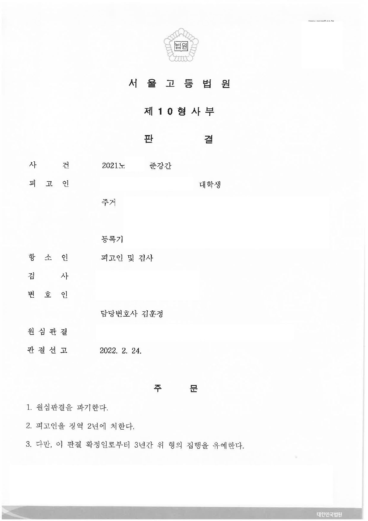 결국 피해자와의 합의가 성사되어 피해자가 재판부에 처벌불원의사를 표시한 합의서를 제출하였습니다. 이와 더불어 의뢰인의 양형자료와 1심 단계까지 무죄주장을 번복하게 된 경위에 대한 해명 등 변호인 의견을 개진하며 선처를 받기 위해 노력하였습니다. 결국 의뢰인은 항소심 판결 결과 집행유예를 선고 받아 사회로 복귀할 수 있었습니다.