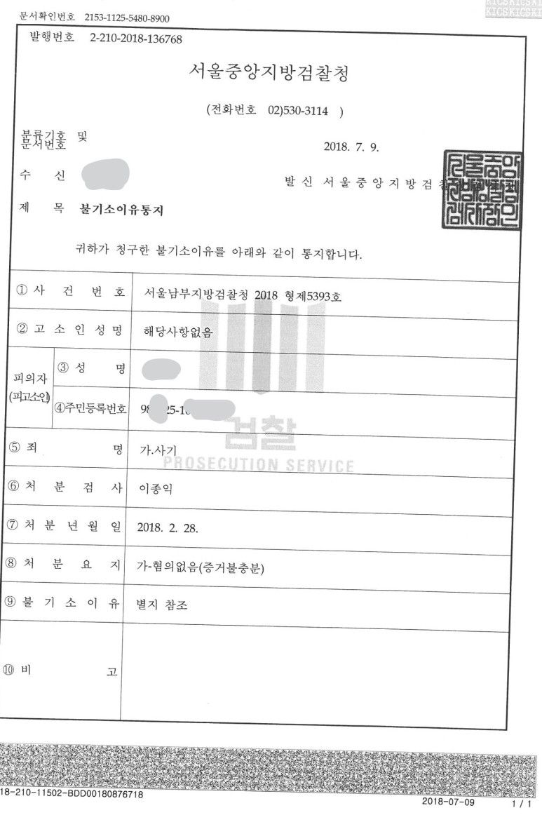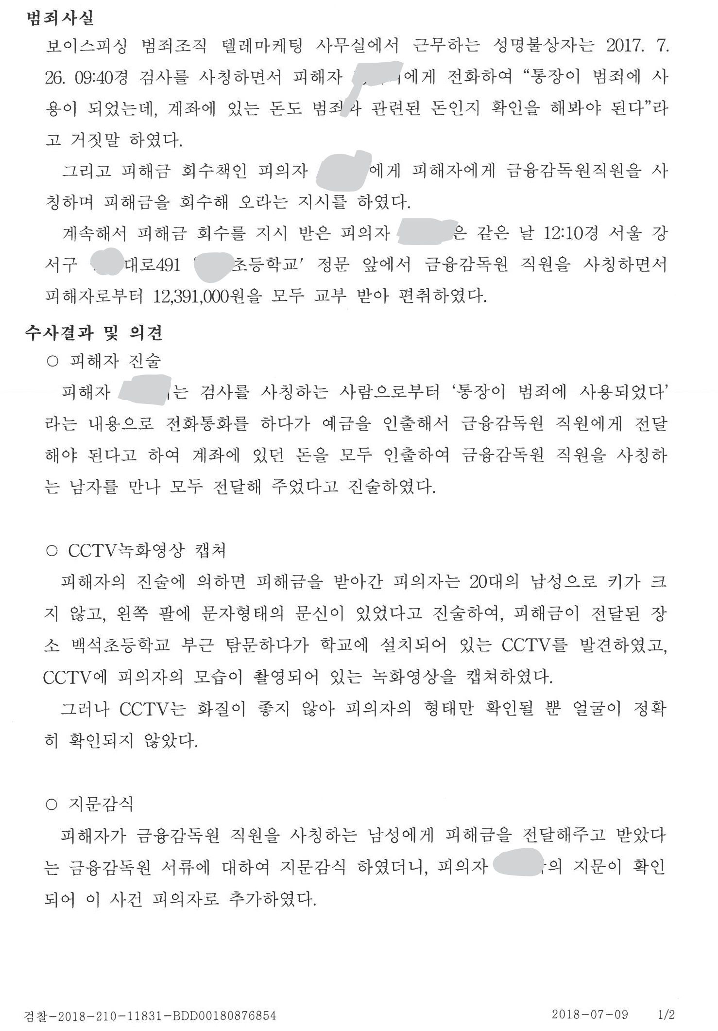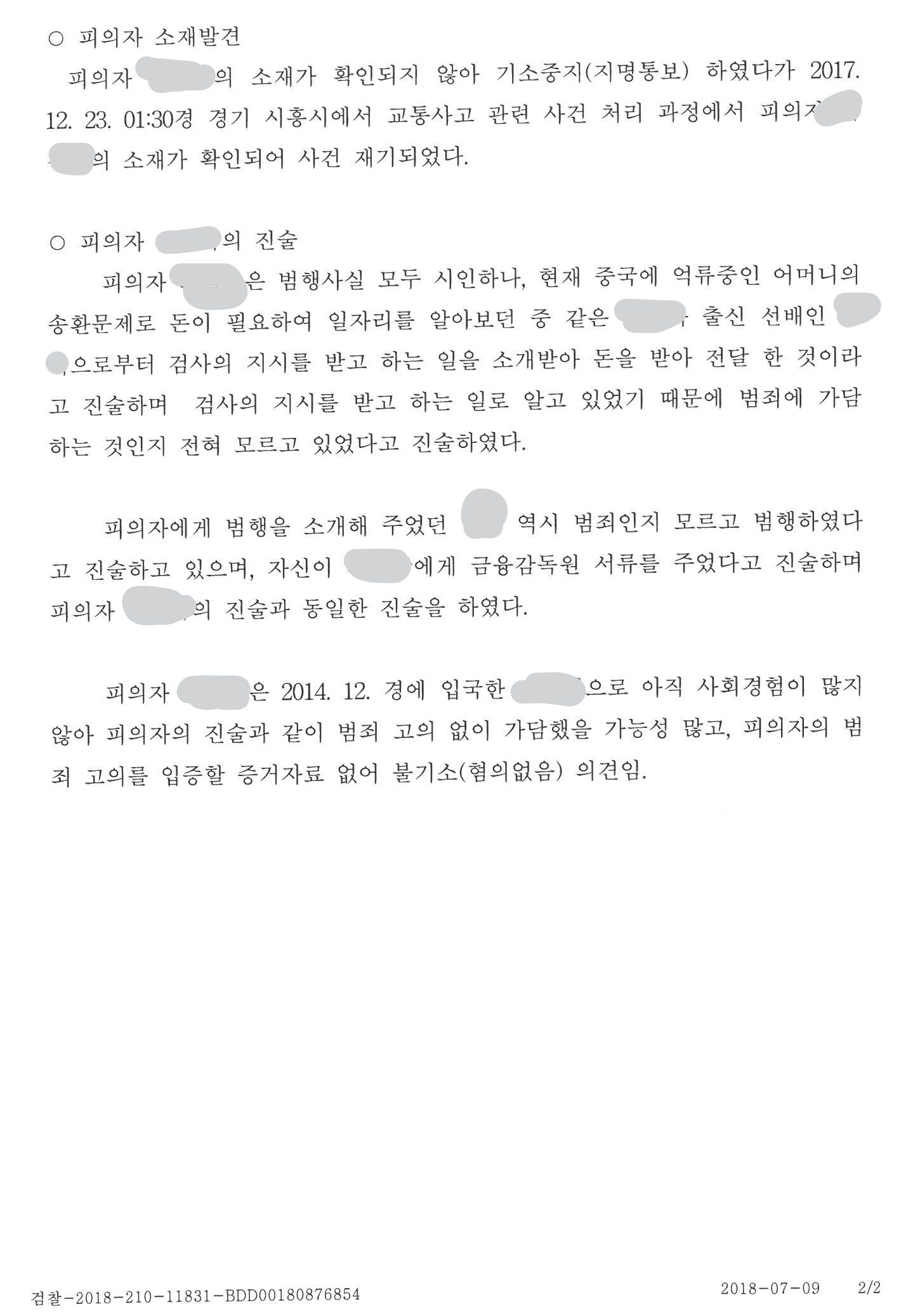 *보이스피싱 범죄 조직에서 가장 말단에 있는 현금전달책인 피의자가 보이스피싱 범죄인지 모르고 가담하였을 가능성이 많다는 등을 이유로 사기 혐의 불기소처분을 내린 사안.