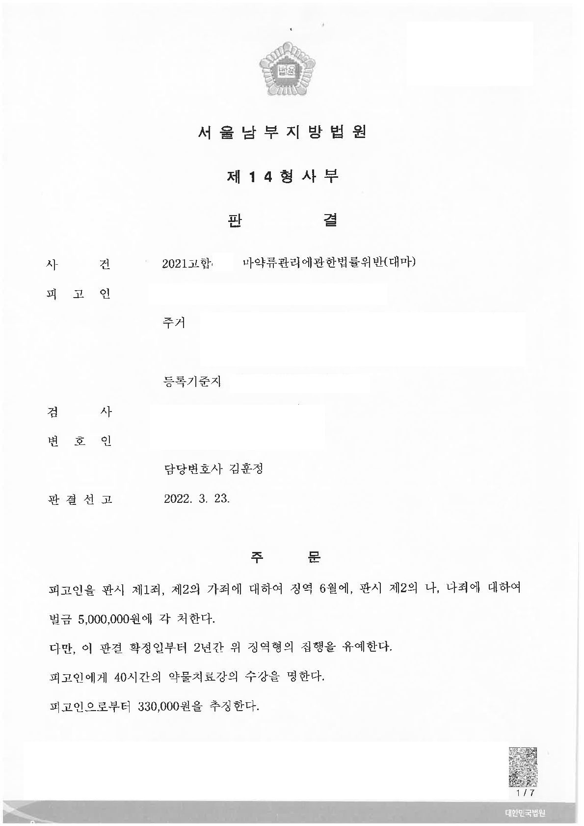 의뢰인은 코로나 사태로 인한 사업 악화 및 투자실패, 가족의 병환 등으로 인해 정신과적 질환을 앓고 있었고, 이러한 부분이 정상참작 되어 대마 매수 및 1차 흡연에 대해서는 집행유예 판결이, 2, 3차 흡연에 대해서는 벌금형의 판결이 선고되었습니다. 이는 재판부가 의뢰인을 선처하여 법이 허용하는 최대한의 관대한 판결을 내린 것입니다. 의뢰인의 집행유예 기간 중 범행만 별개로 벌금형을 선고하는 방식으로, 의뢰인은 구속의 위험을 벗어날 수 있었습니다.