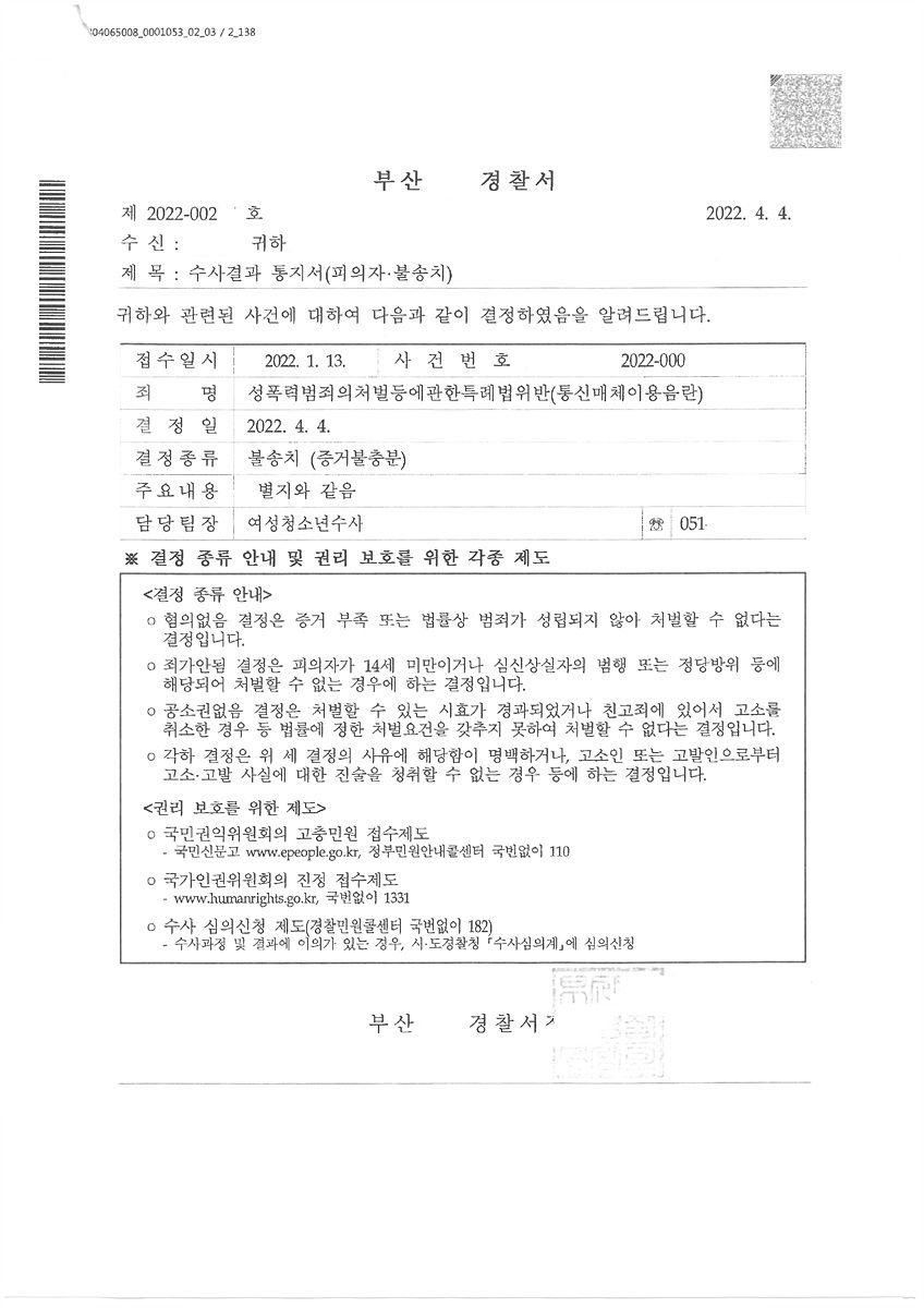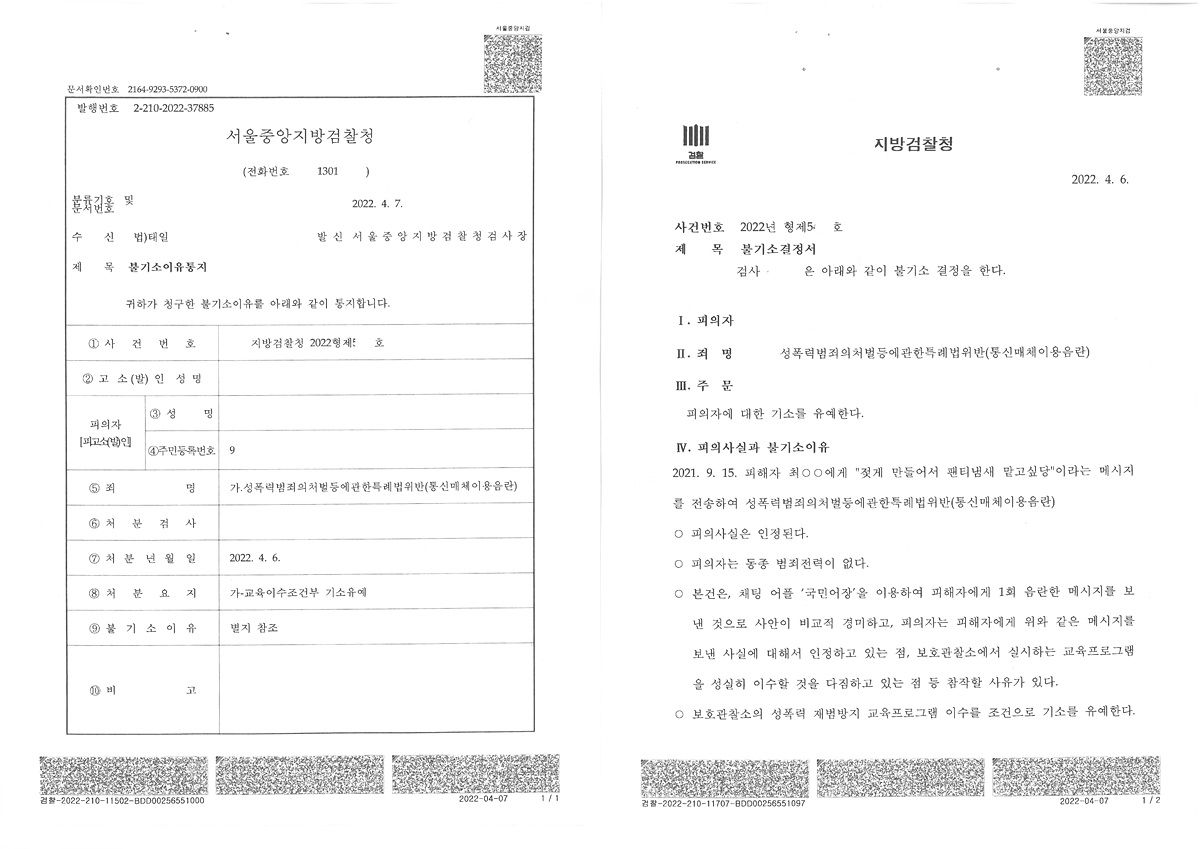 교육받지 않겠고 한 번 판단을 받아보겠다는 의사를 전달한 이후 실제 통매음과 관련하여 혐의없음 불기소처분을 받은 사례도 여러 건이 있습니다. 위 불기소이유서에도 나와 있는 바와 같이 통매음에 대해서 인정한 적이 없기 때문에 통매음을 인정하고 반성하고 있다는 내용은 들어가 있지 않습니다. 즉 합의는 전혀 없었습니다.