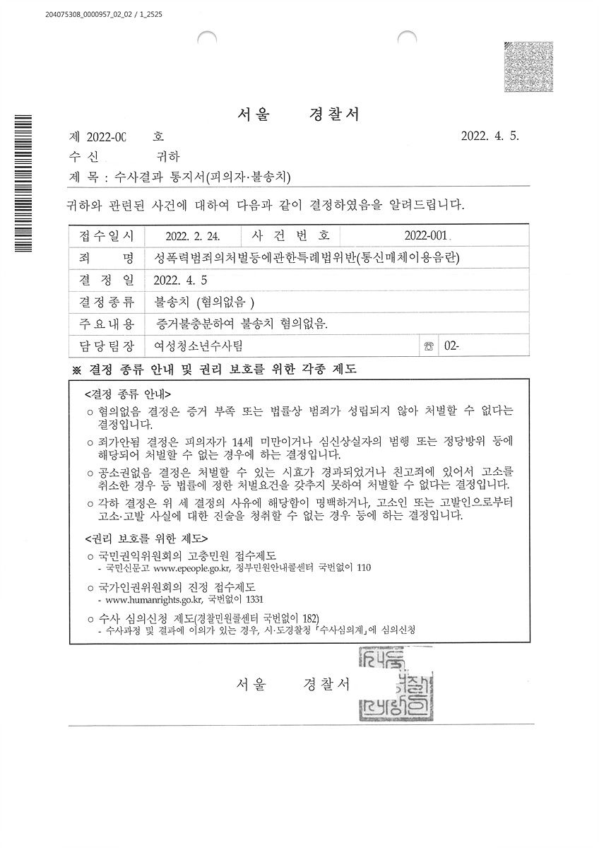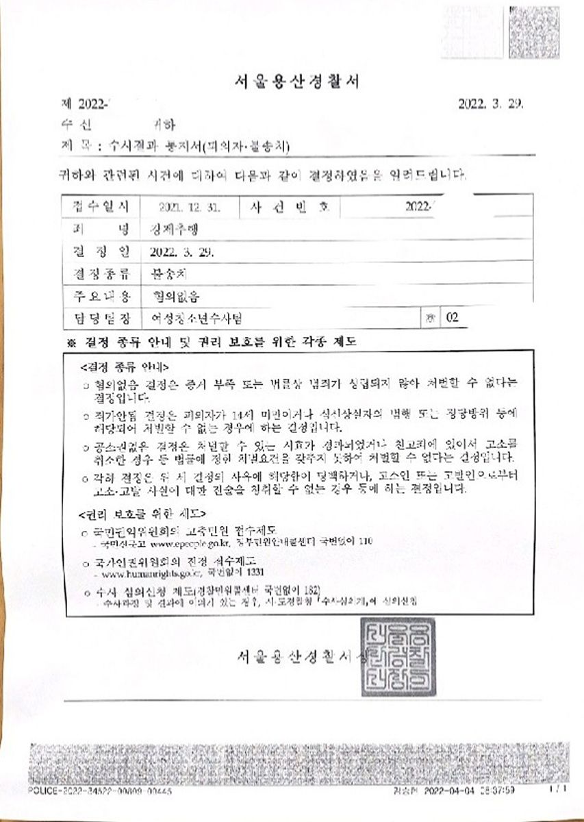예상대로 불송치결정이 내려졌다는 기쁜 소식을 전할 수 있었습니다.