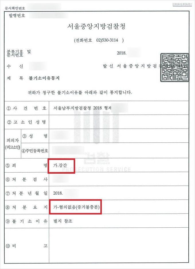 결국 검찰은 법률사무소 로진의 전담팀이 작성한 변호인 의견서의 내용을 전면적으로 인정해주었고, 의뢰인의 강간 혐의는 무혐의 처분을 받게 되었습니다.