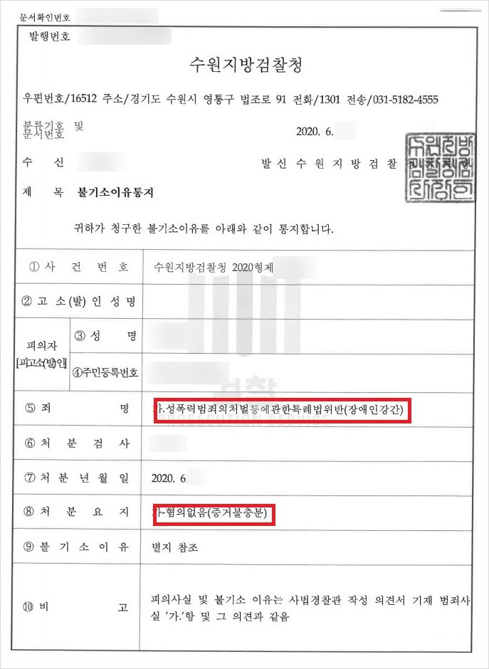 결국 검찰은 법률사무소 로진의 전담팀이 작성한 변호인 의견서의 내용을 전면적으로 인정해주었고, 의뢰인의 성폭력범죄의처벌등에관한법률위반(장애인강간)은 무혐의 처분을 받게 되었습니다.