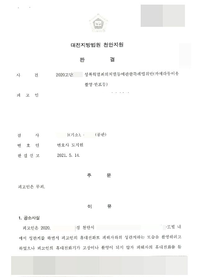 오늘은 최근 카메라등이용촬영죄로 기소가 되어 재판과정에서 저의 도움을 통하여 의뢰인의 억울함을 적극 변론한 끝에 무죄판결을 받게된 사례를 하나 소개해 드리고자 합니다.