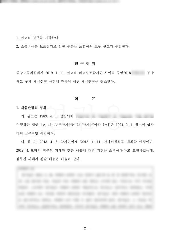 ② 사회통념상 사용자와 근로자 사이의 고용관계를 계속할 수 없을 정도로 참가인에게 책임이 있는 경우라고 보기 어려워 이 사건 면직 처분은 사용자에게 맡겨진 재량권의 한계를 벗어나 위법하므로 이 사건 재심판정은 적법하다고 판단하였습니다.