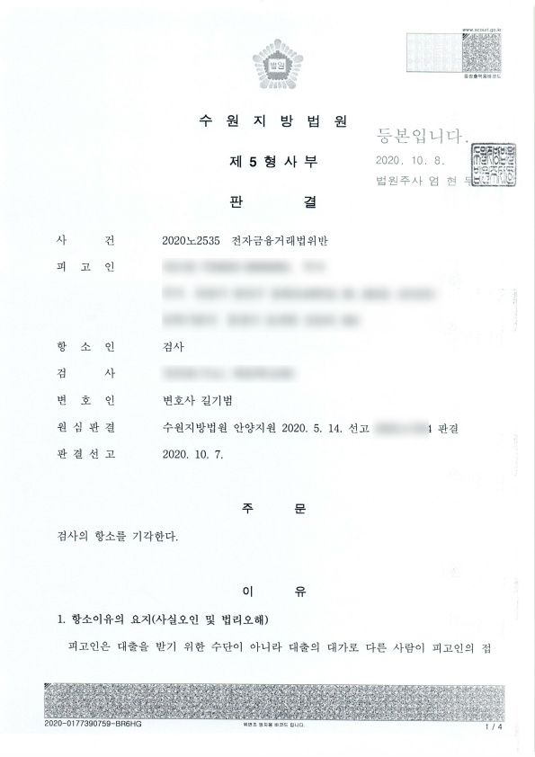 최근 제가 맡은 사건에서도 의뢰인이 대출을 해주겠다는 말에 속아 체크카드를 빌려줬다가 전자금융거래법위반으로 기소되었다가 항소심에서 항소기각(무죄)된 사례가 있어 소개하겠습니다.