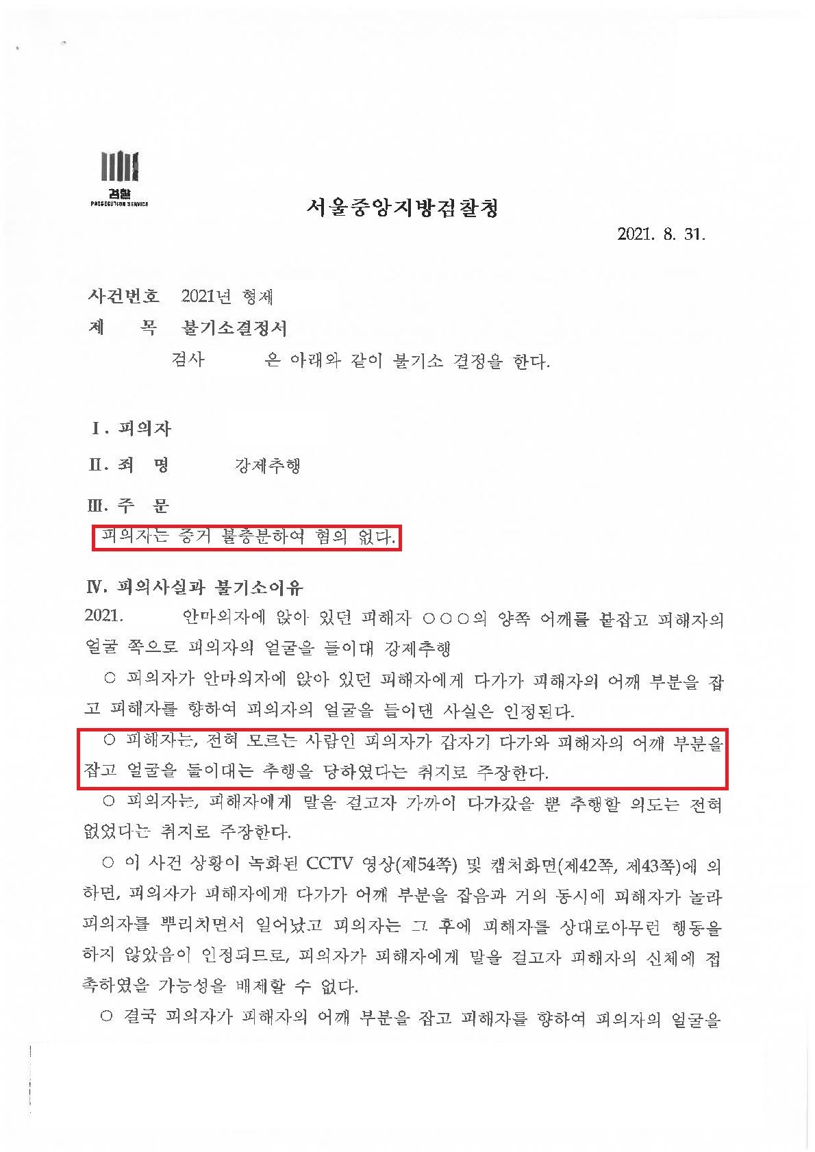 위와 같은 전략으로 의뢰인은 피해자와 합의하였고 자신의 잘못을 인정하였지만, 의뢰인의 행위를 추행으로 평가하기에는 다소 지나치다는 변호인 의견이 받아들여져 결국 검찰로부터 무혐의 처분을 받을 수 있었습니다. 이와 같이 사실관계에 대해 당사자 본인이 혐의사실을 인정하더라도, 변호인의 입장에서 이와 별개로 법리적으로 무죄 주장이 가능하다는 것을 확인할 수 있는 사례(즉, 논리적 모순이 아님)이고, 때로는 합의를 하는 것이 무혐의 처분을 받기에 유리한 경우도 있습니다.