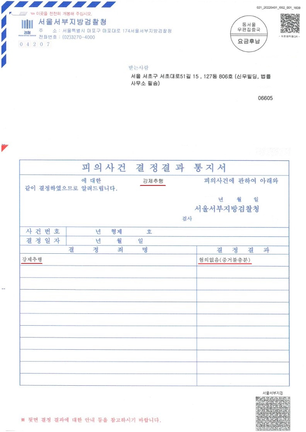 앞서 말씀드린 다양한 방법으로 수사 단계를 신중히 진행하였고 이에 서울서부지방검찰청은 의뢰인님에게 강제추행죄에 대하여 "불기소처분(무혐의)"을 하였습니다.