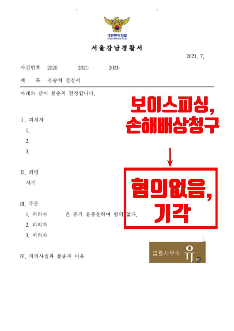 서울강남경찰서는 법률사무소 유(唯) 형사전문변호사가 작성하여 제출한 변호인의견서 등의 내용을 대폭 수용하여 의뢰인에게 혐의없음 불송치결정을 하였으며, 수원지방법원 또한 피해자들의 의뢰인에 대한 손해배상청구를 기각하는 판결을 선고하였습니다.