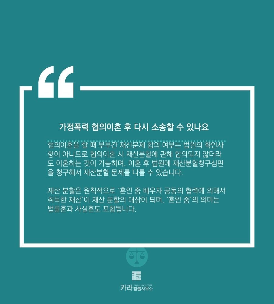 그럼에도 협의이혼에 이르렀다면 재산분할이나 위자료 청구를 다시 할 수 없다고 생각하시는 분들이 많은데요,