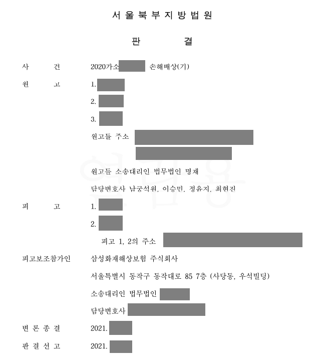 법원은 가해 어린이와 그 부모에게 995만원을 손해배상하라는 판결을 선고하였습니다. 995만원 중 700만원은 정신적 손해에 따른 위자료였고, 소송을 제기한 덕분에 의뢰인은 사과도 반성도 하지 않는 가해 어린이 가족에게 법적 책임을 물을 수 있었습니다.