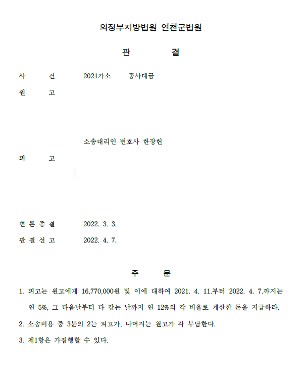 위 사건은 공사계약서가 작성되어 있지 않고, 공사대금에 합의가 없는 공사계약에 대해서 승소에 준하는 금액을 받아낸 사건입니다.