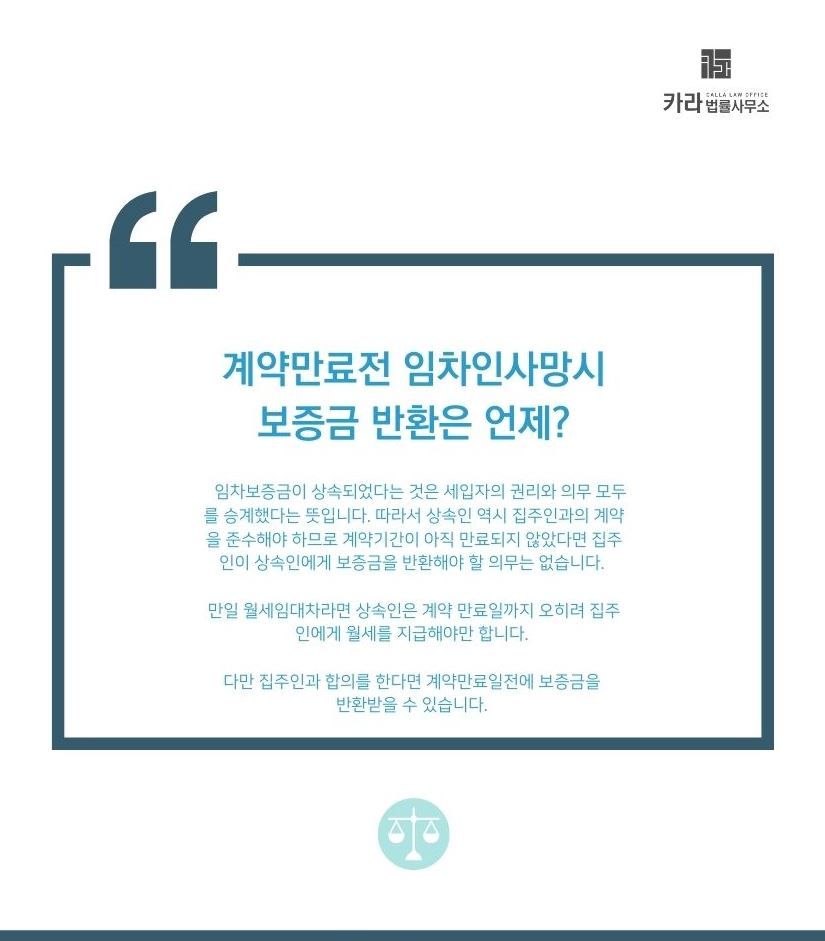 계약만료 전 임차인 사망하면 집주인은 보증금을 상속인에게 돌려줘야 하나요?